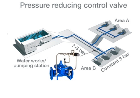 Example: The pressure is 7-8 bar, which is appropriate to supply the consumers in area A but too high for the consumers in area B. Therefore, a pressure reducing control valve is installed to reduce the pressure to 3 bar in area B.