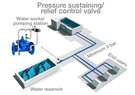 Example: When the water reservoir fills, the pressure drops, leaving the consumers without water. Therefore, a pressure sustaining control valve is installed to maintain the pressure for the consumers.